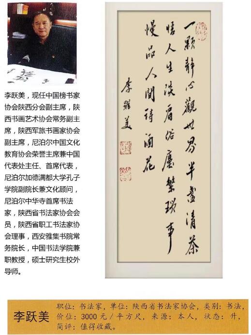 就是这个诗情画意的美域蓝田孕育出一位著名的书法家——李跃美老师,出生于1960年,号蓝田布衣,作为一位曾长期生活在西安故土的书法家,收获了太多的荣誉,现为中国榜书家协会陕西分会副主席,陕西省书画艺术协会常务副主席,陕西军旅书画家协会副主席,尼泊尔中国文化教育协会荣誉主席兼中国代表处主任、首席代表,中国书法尼泊尔学会副会长兼秘书长,尼泊尔加德满都大学孔子学院副院长兼文化顾问,尼泊尔总理府中国书法顾问,尼泊尔中华寺首席书法家。陕西省书法家协会会员,陕西省职工书法家协会理事,河南省青年书法家协会理事,西安雅集书院常务院长,中国书法学院兼职教授、硕士生校外导师,西北大学中国西部书画研究院研究员,河南省洛阳国际牡丹书画院副院长。